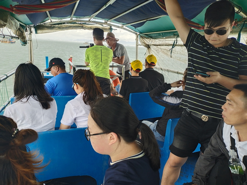 第一日,天公作美,潔白的云朵遮擋了盛夏火球般的太陽(yáng),湛藍(lán)的天空令人心曠神怡。前潤(rùn)家人乘坐旅游大巴一路向東,沿著蜿蜒曲折的海岸線,來(lái)到了著名的海濱風(fēng)景度假區(qū)惠州巽寮灣。巽寮灣位于惠東縣城平山鎮(zhèn)南部,南海大亞灣的東部,總面積105平方公里。以石奇美、水奇清、沙奇白著稱,被譽(yù)為“綠色翡翠”和“天賜白金堤”。這里是粵東數(shù)百公里中海水最潔凈的海灣之一。除了干凈的海灘外,海灘上軟細(xì)潔白的海沙含硅量高達(dá)99%。體會(huì)人與自然親密的接觸,海水清澈,海底平坦,皓白的弧形沙灘,沙質(zhì)幼細(xì)且晶瑩潔凈,樂趣無(wú)窮。后乘船出海捕魚,在漁民的帶領(lǐng)下,登船出海,暢游百島風(fēng)情、觀海上風(fēng)光,親身感受捕魚的樂趣。出海游玩之后,饑餓也隨之而來(lái),粉絲扇貝、油煎皮皮蝦、花甲蒸蛋、農(nóng)家時(shí)蔬……也許不及都市餐廳里的精致與奢華,但原汁原味的地方美食讓人更覺意猶未盡。