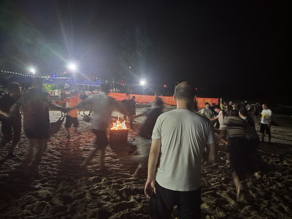 天色漸昏,半邊海天被夕陽(yáng)鍍上了一層金色。遠(yuǎn)方的景致在視線中緩緩地蔓延鋪陳開來(lái),天空和運(yùn)動(dòng)閃著遠(yuǎn)古洪荒般的琉璃瓦的光澤,拓寬著茫茫無(wú)限的空間。我們愉快的自助燒烤也即將開始了,盡興的玩了一下午,大家團(tuán)坐一起烹制美食、無(wú)限暢談……不知何時(shí),紅紅的篝火燃燒了起來(lái),前潤(rùn)家人們圍著火堆唱歌、跳舞、做游戲。我們從陌生到認(rèn)識(shí),從認(rèn)識(shí)到熟悉……
