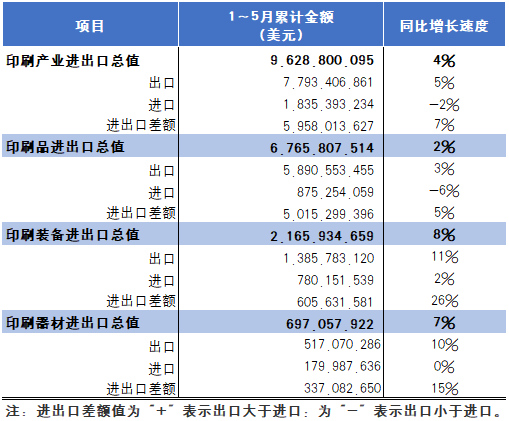 根據(jù)國家海關(guān)總署最新發(fā)布的統(tǒng)計(jì)數(shù)據(jù),2024年1~5月國內(nèi)印刷品、印刷裝備、印刷器材進(jìn)出口總值為96.29億美元(參見表1),與去年同期相比增長4%。