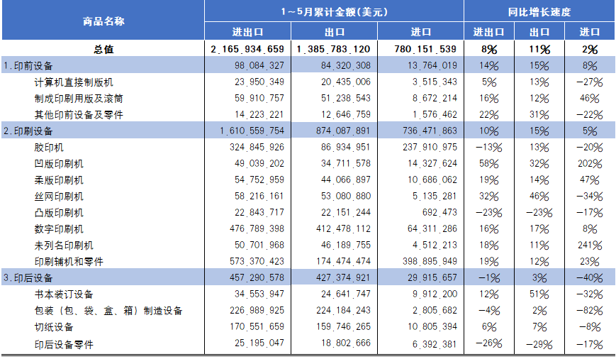 2024年1~5月國內(nèi)印刷裝備出口13.86億美元(參見表3),比去年同期相比增長11%。其中,印前設(shè)備出口8432.03萬美元(同比增長15%)、印刷設(shè)備出口8.74億美元(同比增長15%)、印后設(shè)備出口4.27億美元(同比增長3%)