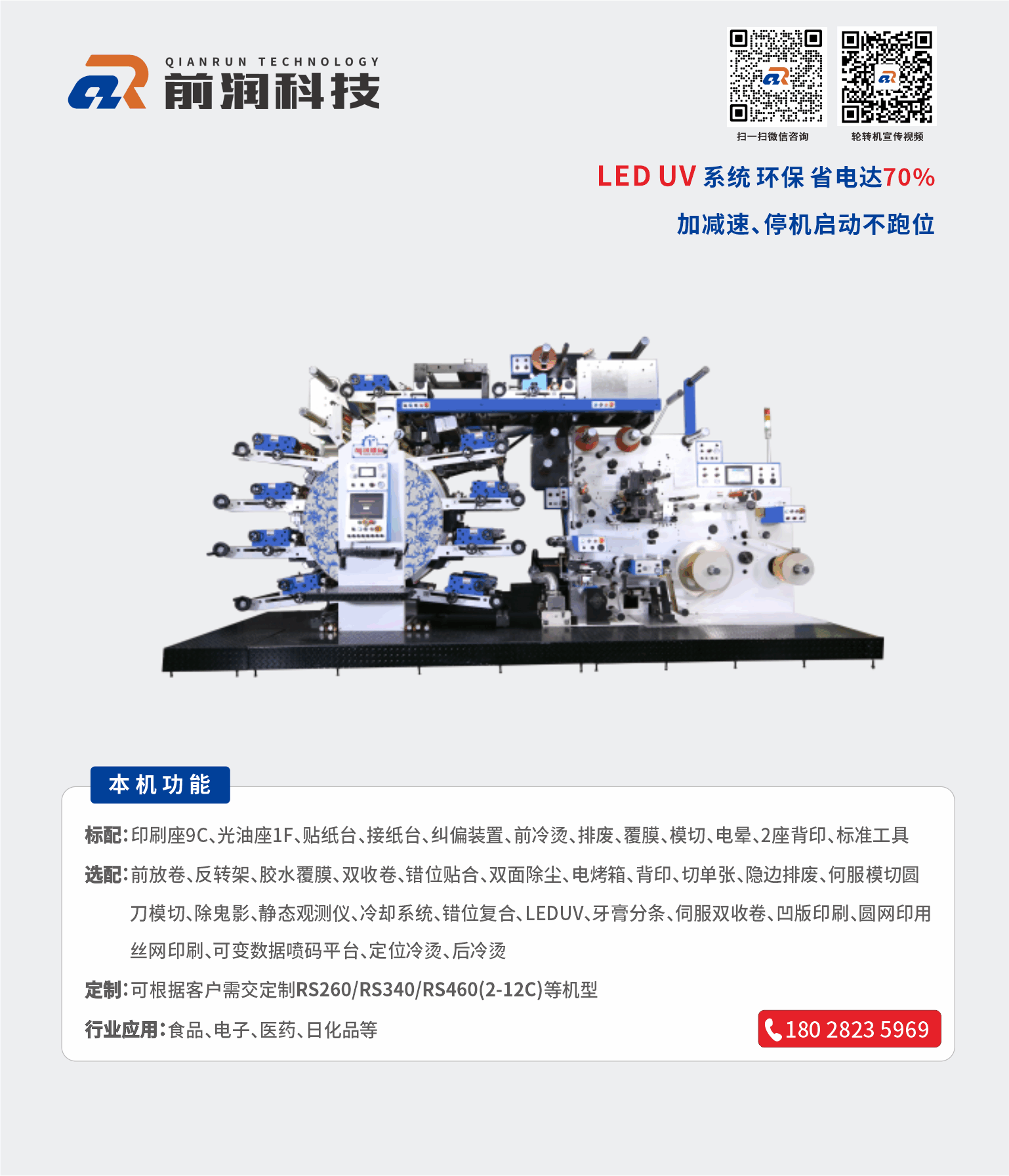 主營設備商標印刷機衛星式輪轉印刷機模切機 等產品,公司可為客戶量身制定商標機、輪轉機等自動化解決方案。公司有強大的研發體系,確保能為客戶量身定制各類非標且最有價值的產品;前潤機械在國內外擁有極高的市場占有率及良好的信譽,贏得了眾多知名企業的青睞與合作,產品暢銷多個國家和地區,市場銷量近萬臺;我們愿與您攜手合作,建立長久雙贏機制,共享成功喜悅!加盟熱線:133 2260 8282